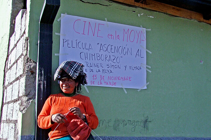 2009 werden in Quito im Filmkunstkino „Ocho y Medio“ wieder „Die Besteigung des Chimborazo“ und weitere Filme gezeigt. Mein Roman „Regenbogenboa“ wurde ins Spanische übersetzt und wird in der „Casa Humboldt“ vorgestellt, wo auch die Fotoausstellung „Die Fiesta von Sarayaku“ gezeigt wird, mit Fotos, die ich 2005 gemacht hatte. In jenem Jahr konnte die traditionelle fiesta das erste Mal wieder stattfinden nach den Bedrohungen, denen die Urwaldgemeinde durch Erdölkonzerne ausgesetzt war und es noch immer ist. Sarayaku ist weltweit ein Symbol geworden für den Kampf indigener Völker gegen die Umweltzerstörung, ein Beispiel, wie sich eine indigene Gemeinde auf intelligente Weise wehrt. Patricia Gualinga, Tochter des Schamanen Sabino Gualinga, erhielt 2022 den „Olof-Palme-Preis“, „für ihren mutigen Einsatz im Kampf um Erhalt der Lebensbedingungen indigener Völker, das Recht der Natur und das Überleben des Amazonas.“ Ihr Bruder Heriberto Gualinga dreht Filme. Ich bringe ihnen 2009 die Fotos und fahre natürlich auch nach La Moya. Mittlerweile sind seit dem Drehen über 20 Jahre vergangen, wir kommen, um die DVD unseres Films vorzuführen. Die Aufführung findet statt im Rahmen des indigenen „Festival Cine Ecuatoriano Kunturñawi“, veranstaltet von der in Riobamba ansässigen „Fundación arte nativo“, „einer im Jahre 2000 von Indigenen und Mestizen gegründeten Organisation für soziale, pädagogische und kulturelle Zwecke, inspiriert von sozialer Gerechtigkeit und Solidarität mit den am stärksten gefährdeten ländlichen und städtischen Sektoren, um deren Lebensqualität zu verbessern.“