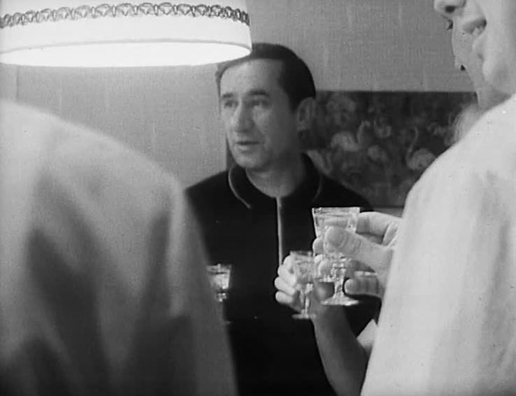 Blick auf die Leningrader Ingenieure mit ihren Kollegen am Gästetisch (halbtotal). Dimitri Bassilow trägt einen Trinkspruch vor (halbtotal) (O-Ton) "Erster Toast, ich will auf unsere Freundschaft und gemeinsame Arbeit anstoßen". Alle erheben sich und prosten sich zu (halbtotal) (O-Ton). Blick auf die anstoßenden Kollegen (halbnah). Zoom auf die Flaschen auf dem Gästetisch (halbnah). Die beiden Leningrader Ehefrauen reichen die Speisen weiter (halbnah). Erneut wird mit den Kristallgläsern angestoßen (halbnah) (O-Ton). Frau Bassilitsch bringt eine Schüssel mit "Pelmeni" zum Tisch (halbtotal) (O-Ton). Teigtaschen werden auf die Teller gelegt (nah). Kommentar: "Solche Gelegenheiten sind selten, Dimitri und Sascha arbeiten für gewöhnlich...(Gesicht von Frau Bassilitsch)...Normalschicht, Karl-Heinz...(Einblendung)...und die anderen im Montagerhythmus. Nun nimmt man sich Zeit...(Gesichter der essenden Arbeitskollegen)...keine verschenkte Zeit, sie wissen was sie sich leisten können". Blick auf die Runde am Tisch, vertieft in Gesprächen während des Essens (halbnah) (O-Ton). Umschnitt auf Karl-Heinz bei seinem Toast (halbnah) (O-Ton) "Wir haben uns schon die ganzen Wochen auf diesen Abend gefreut, und wir waren sehr erstaunt als wir gesehen haben was heute die beiden Frauen für uns zubereitet haben...(Schwenk über die Frauen aus Leningrad)...wir sind sehr gastlich empfangen worden. Wir trinken auf eure Frauen". Alle erheben sich und stoßen mit den Frauen an (halbnah) (O-Ton). Umschnitt. Dimitri Bassilitsch spielt auf dem Akkordeon am Tisch (halbnah) (O-Ton). Rückwärtszoom vom Akkordeonspieler auf die singende Gästerunde am Tisch (halbtotal) (O-Ton). Umschnitt