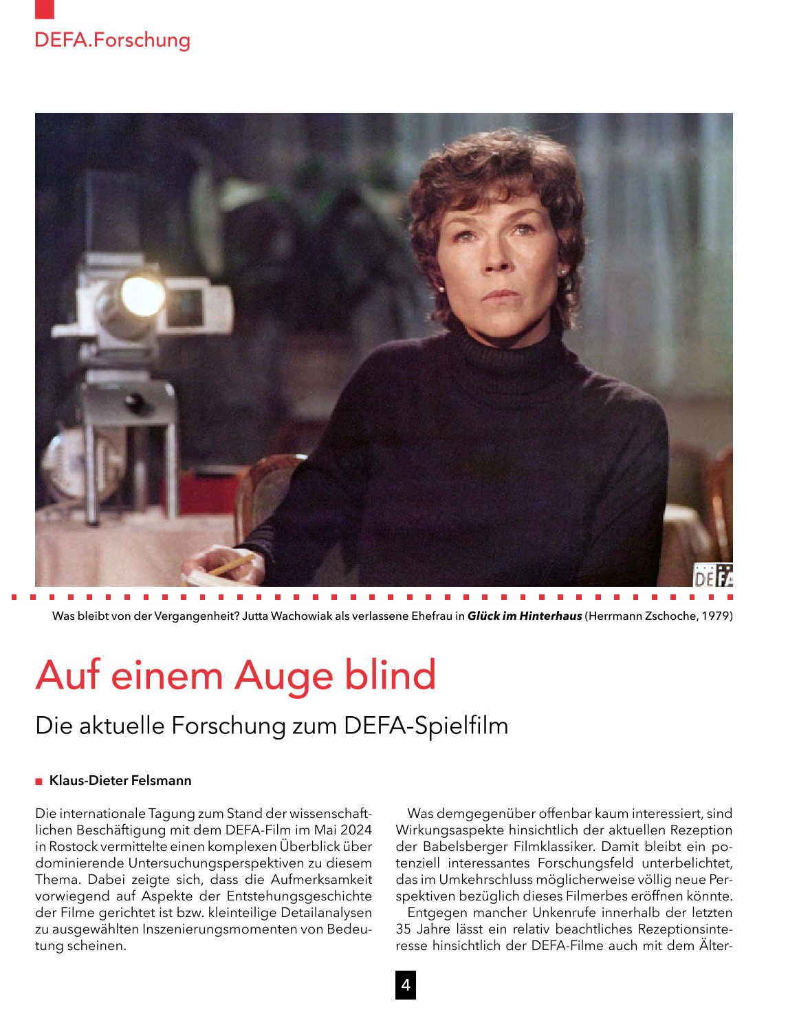 Der DEFA-Experte Klaus-Dieter Felsmann nimmt in seinem Text „Auf einem Auge blind“ Bezug zur aktuellen DEFA-Forschung und verweist auf Leerstellen. Das diesjährige Summer Film Institute der DEFA Film Library in den USA fand zum Thema „Screened Environments“ an der University of Massachusetts in Amherst statt. Organisator Stephan Ehrig stellt die inhaltlichen Schwerpunkte der Tagung vor.