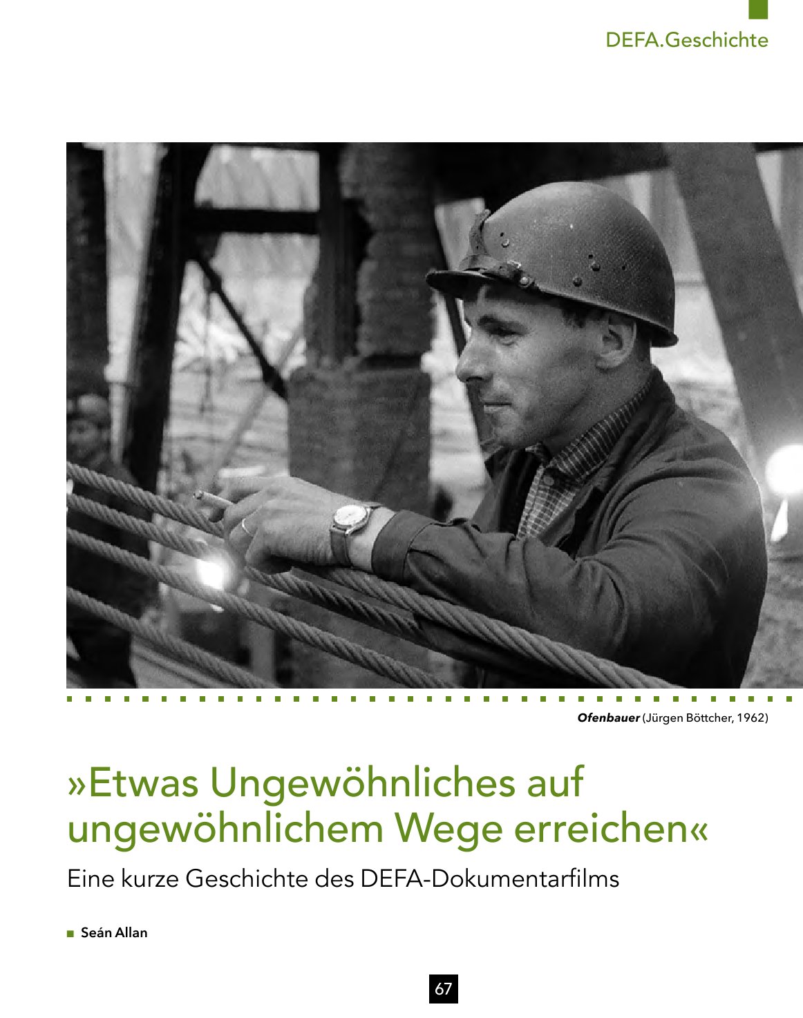 Der schottische Wissenschaftler Seán Allan bietet in seinem Beitrag „Etwas Ungewöhnliches auf ungewöhnlichem Weg erreichen“ einen Überblick auf das DEFA-Dokumentarfilmschaffen im Verlauf der Jahrzehnte. Darüber hinaus widmet sich Jeanpaul Goergen BERLIN – AUGUSTSTRASSE (Günter Jordan, 1979), Roland Steiner stellt seine JUGENDZEIT-Reihe vor und Gerd Kroske schaut zurück auf LA VILLETTE (1990).