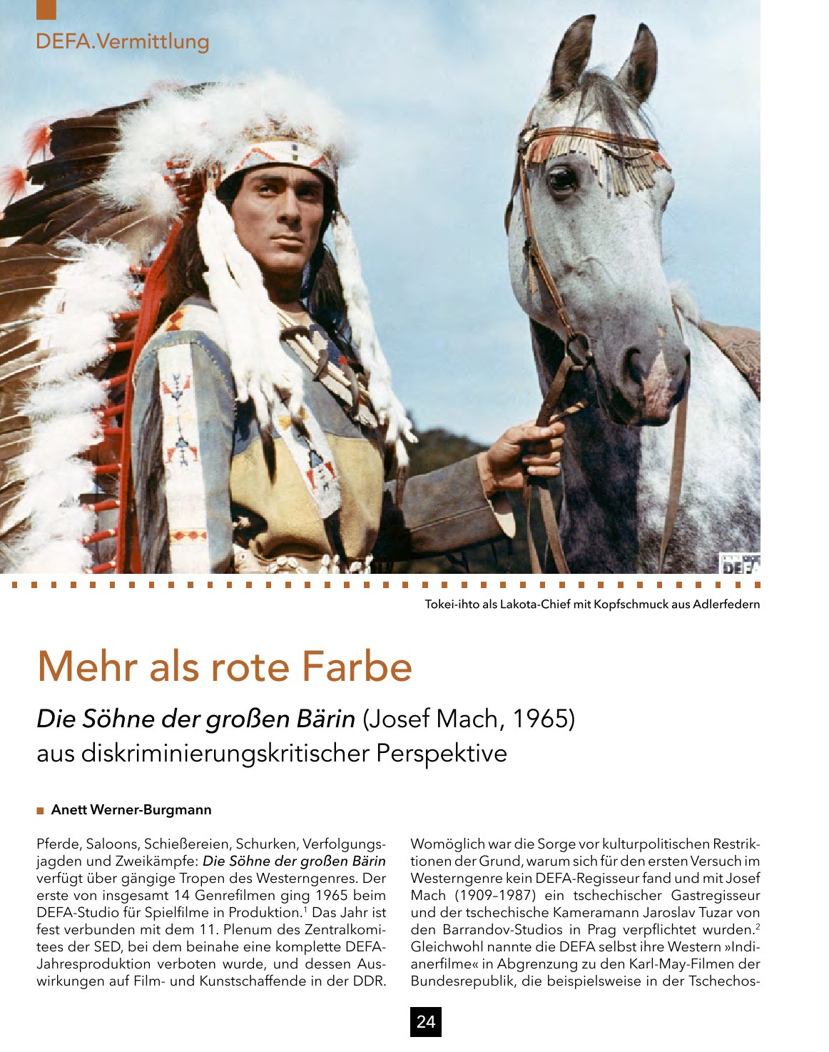 Anlässlich des 50. Jahrestags der Biermann-Affäre im nächsten Jahr betrachtet der Historiker Andreas Kötzing in seinem Artikel, welche Auswirkungen die Ausbürgerung des prominenten Liedermachers innerhalb der DEFA hatte. Fortgesetzt wird die bereits in den vergangenen Heften angestoßene diskriminierungskritische Betrachtung des DEFA-Filmerbes. Im Fokus steht der erste „DEFA-Indianerfilm“ DIE SÖHNE DER GROSSEN BÄRIN (Josef Mach, 1965). Weitere Beiträge widmen sich verschiedenen Aspekten der DEFA-Geschichte. So beschäftigt sich Günter Agde mit dem nicht realisierten Filmprojekt „Die schöne Uta“ von Wolfgang Kohlhaase und Konrad Wolf. Philip Zengel wirft einen Blick zurück auf das erste Nationale Spielfilmfestival der DDR vor 45 Jahren in Karl-Marx-Stadt und Evelyn Hampicke beleuchtet die Darstellung des Christentums im DEFA-Gegenwartsfilm.