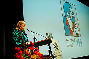 Stiftungsvorstand Stefanie Eckert wies in ihrer Eröffnungsrede auf die zahlreichen Aktivitäten im Konrad-Wolf-Jahr hin. Fotograf: Andreas Domma